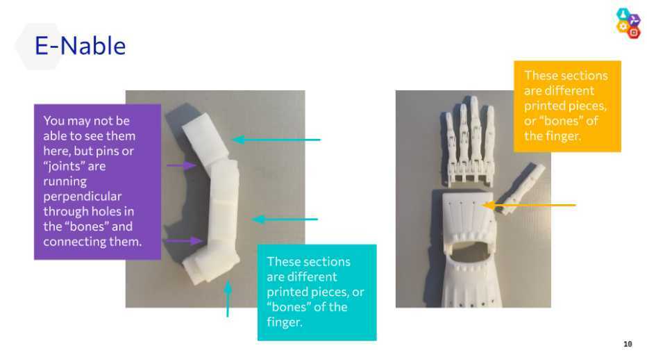 Students will learn about 3D printing in medicine through the exploration of prosthetic arms and hands. Once the students are introduced to the company E-NABLE and to how their prosthetics work, they will be learning about CAD, drawing, and dimensioning. Collectively using what they’ve learned, they will be tasked with designing their own prosthetic finger.
